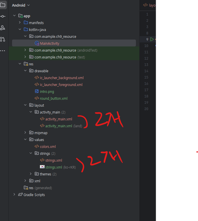 - strings.xml 파일도 2개인데 하나는 영어, 하나는 한국어로 구성할 때임